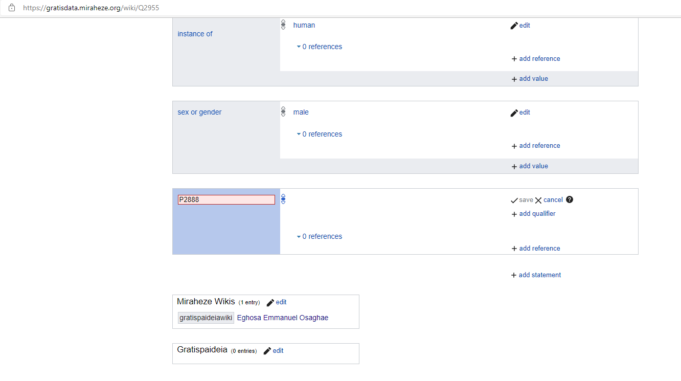 P2888 exact match is an equivalent property to http://schema.org/sameAs and also http://www.w3.org/2004/02/skos/core#exactMatch Anyways, in your case, in the Gratisdata Wikibase instance, you will need to find out how to enable that property availability, because I don't see it: and then after fixing that you can make multiple "sameAs": ["https://stias.ac.za/fellows/eghosa-emmanuel-osaghae/", "https://niia.gov.ng/about-us/dg/", "https://gratisdata.miraheze.org/wiki/Q2955", "https://www.strausscenter.org/person/eghosa-osaghae-2/"] |