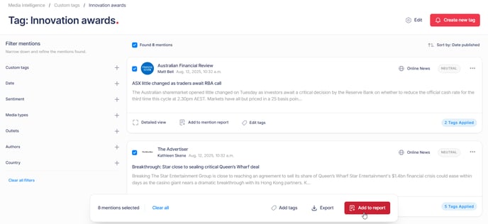 - Select one or more mentions using the checkboxes and click Add tags to apply one or more existing tags.