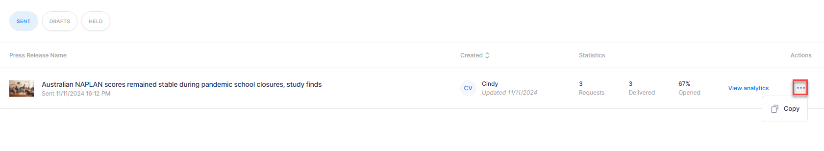 To duplicate a press release, click on the three dots next to the press release you wish to duplicate, then click ‘Copy’ and then confirm. This will create an exact copy of the release under ‘Drafts’.