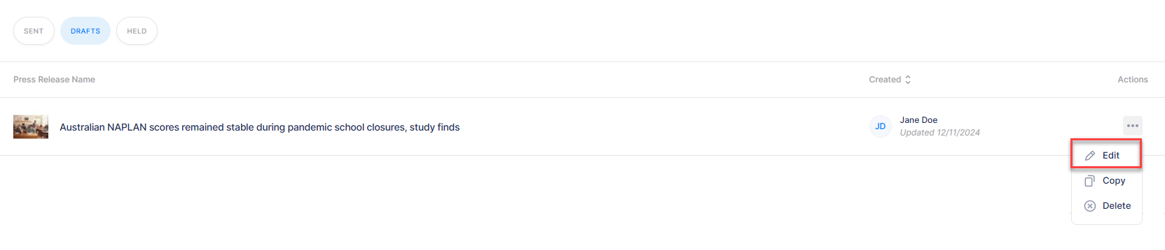 You can then click on the three dots next to the daft press release to edit it.
