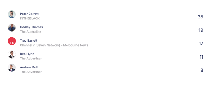 - Top authors and journalists: See the top five authors generating mentions in this search.