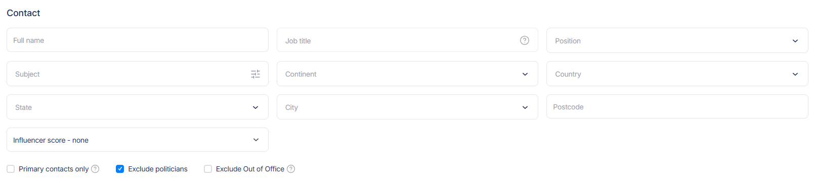 Use the ‘Search contacts, outlets or keywords’ field to search for words within any field across the database, including any profile notes on the contact or outlet.