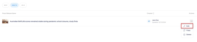 To duplicate a press release, click on the three dots next to the press release you wish to duplicate, then click ‘Copy’ and then confirm. This will create an exact copy of the release under ‘Drafts’.