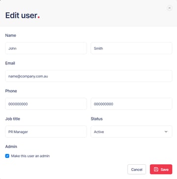 - You can then update the user's details, such as contact details and job title, and check the ‘Admin' box to make this user an account admin.