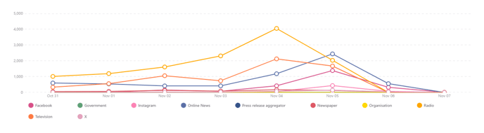 - Coverage timeline: View the spread of your mentions by media type across the given time period. Use this chart to see how your media coverage changes over time and how each media type contributes to the shifts and trends in your results.