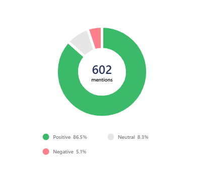 - Article-level sentiment: A breakdown of the sentiment of the articles in the search. Sentiment is assessed at the overall article level. Use this metric to evaluate the general tone of coverage captured by your search.