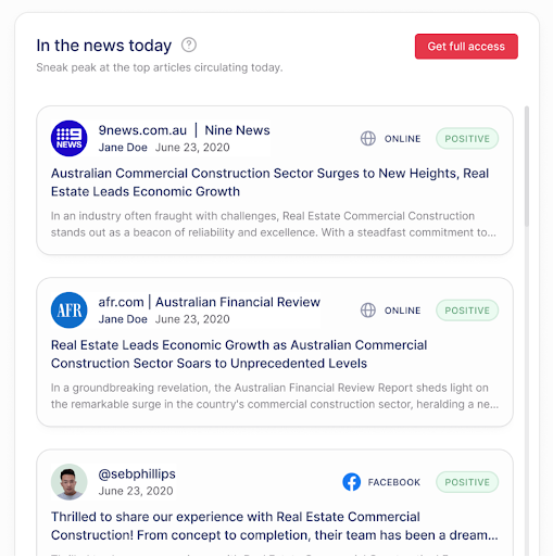 Simply scroll through the headlines to see what’s trending. Click on ‘Get full access’ for more information about our Media Monitoring product plans.