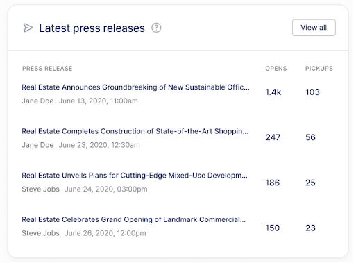 You can view a snapshot of your most recent press releases or click on a specific one to dive into its performance metrics, including opens, clicks, and media pickups.