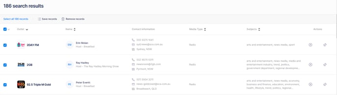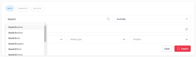 Use keyword search to find contacts and outlets by their name, which can also be used to search specific terms. The keyword field uses an auto-suggest prompt, making searching for targeted individuals and organisations easy. Select a record from the drop-down suggestions to return an exact match result.