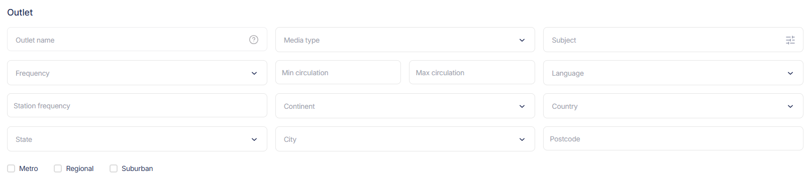 Refine your search by specifying criteria relating to the outlet. Type in an outlet’s name or select from the media type options. You can also choose to target outlets that cover specific subjects by selecting from the extensive subject listings.