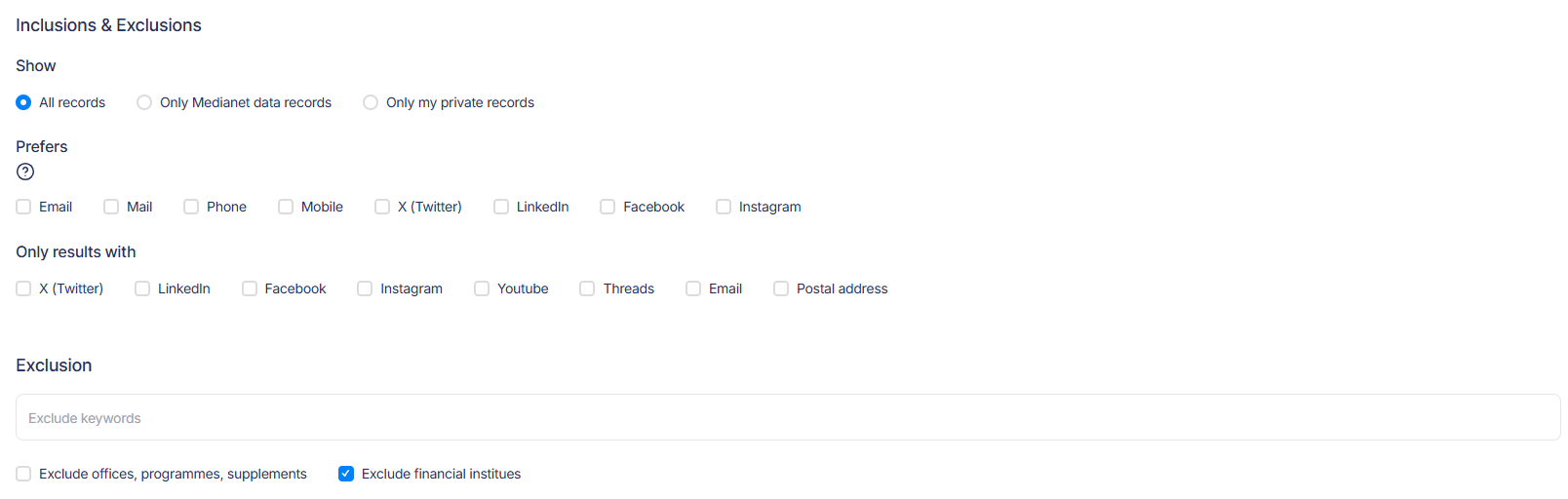 Narrow your results further by finding records with Twitter, LinkedIn, Facebook, Instagram and other specific social media profiles to expand your potential communication options. The ‘Exclusion’ fields allow you to define what you do not want to see in your results, further refining your search