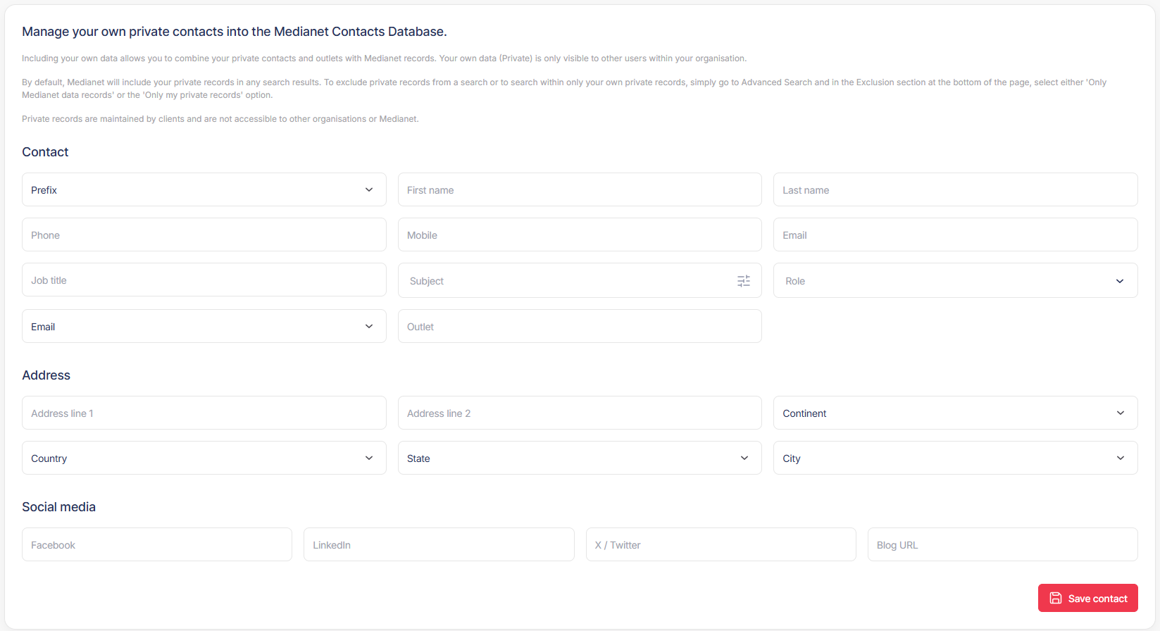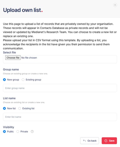 As a subscriber, you can upload and distribute to a list of contacts that are privately owned by your organisation. Once uploaded, these records will appear in the Contacts Database as private records and can not be viewed or updated by Medianet, and will only be visible to others within your own organisation. Including your own data allows you to combine your private contacts and outlets with Medianet records.