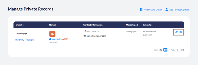 To edit or delete a private record, simply click on the pencil or bin icon next to the record you wish to apply this to.